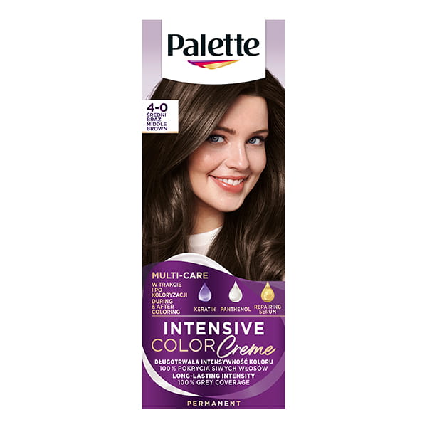 Trwała farba do włosów, pokrywająca siwe włosy, która nadaje niewiarygodnie intensywne i długotrwałe kolory, wibrujące blaskiem - Schwarzkopf Palette Intensive Color Creme Średni Brąz 4-0.