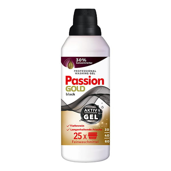 Żel do prania czarnych tkanin Passion Gold Black. Innowacyjna formuła piorąca, wnikająca głęboko we włókna. Nadaje pranym tkaninom przyjemny, świeży zapach. Zawiera aktywne enzymy wspomagające i ułatwiające pranie.