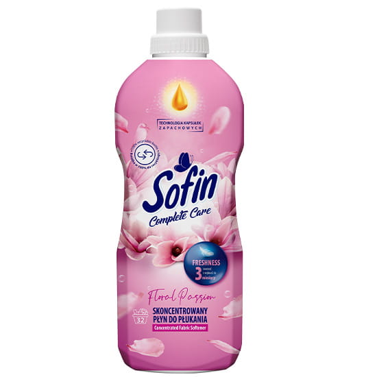 Skoncentrowany płyn do płukania tkanin, zmiękcza i nadaje świeży zapach twoim ubraniom - Sofin Sofin Complete Care Floral Passion.