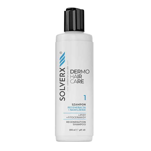 Regenerujący szampon do włosów przywracający elastyczność i nawilżenie włosom suchym dzięki kompleksowi HairFlux™ i glikolipidom. Rozpocznij kurację odbudowującą - Solverx Dermohair.