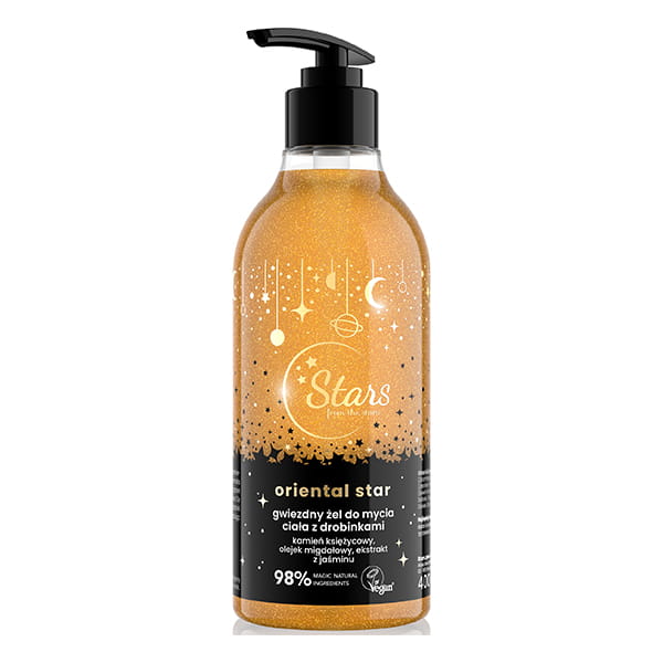 Gwiezdny żel do mycia ciała z drobinkami, delikatnie oczyszcza skórę, nie podrażnia i nie wysusza. Zawiera rozświetlający kamień księżycowy, migdał oraz jaśmin - Stars From The Stars.