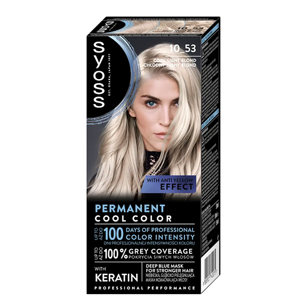Trwała farba, która zapewnia chłodny, jasny odcień blond, 100% pokrycia siwych włosów i efekt jak po wyjściu z salonu. Odkryj intensywny kolor pełen blasku - Syoss 10-53 Cool Light Blond.