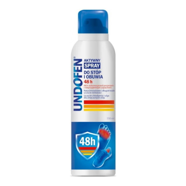 Undofen aktywny spray do stóp i obuwia zapewnia świeżość przez 48 godzin oraz pozwala przywrócić komfort , a tym samym odzyskać pewność siebie.
