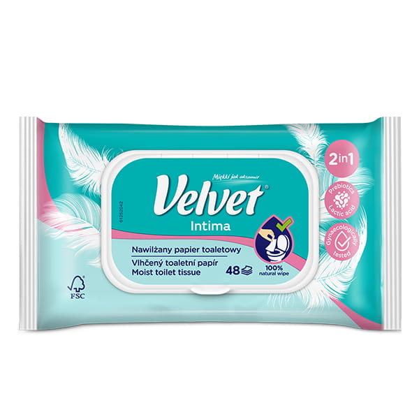 Nawilżony papier toaletowy 2w1, który można traktować jako chusteczki do higieny intymnej z zawartością kwasu mlekowego, prebiotyków, inuliny i wyciągu z aloesu zapewnia uczucie komfortu, odświeżenia i łagodnej pielęgnacji o subtelnym zapachu świeżości - Velvet Intima Nawilżony Papier Toaletowy 2w1.