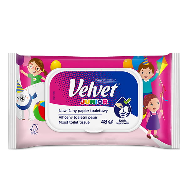 Łagodny, nawilżony papier toaletowy zapewniający poczucie doskonałej czystości i świeżości, przeznaczony dla dzieci o delikatnym brzoskwiniowym zapachu - Velvet Nawilżony Papier Toaletowy.