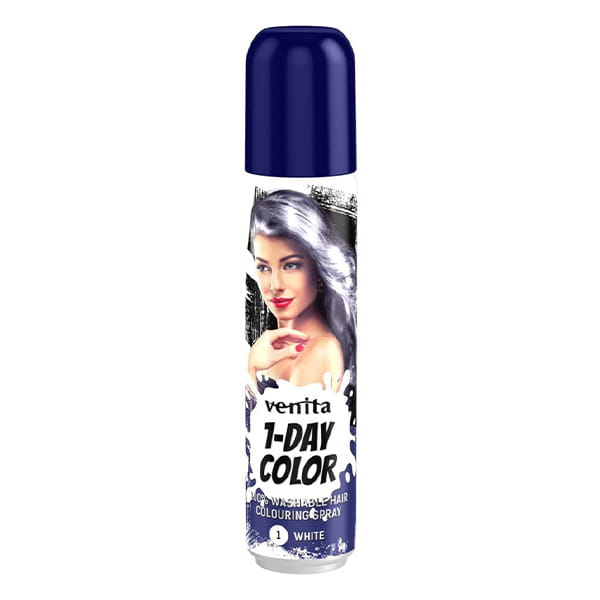 Jednodniowy koloryzujący spray do włosów o delikatnej formule, nie zawierający w swoim składzie amoniaku i utleniaczy, zmywalny już po pierwszym użyciu o kolorze śnieżnej bieli - Venita 1-Day Color Śnieżna Biel 1.