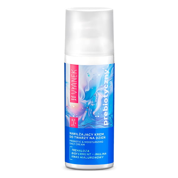 Prebiotyczny krem do twarzy na dzień nawilżający z trehalozą, do każdego rodzaju cery, szczególnie suchej, odwodnionej i wrażliwej. Intensywnie nawilża i odbudowuje mikrobiom skóry. Wspiera odbudowę bariery hydrolipidowej, wygładza drobne zmarszczki i poprawia elastyczność skóry, przyspieszając jej regenerację - Vianek Prebiotyczny.