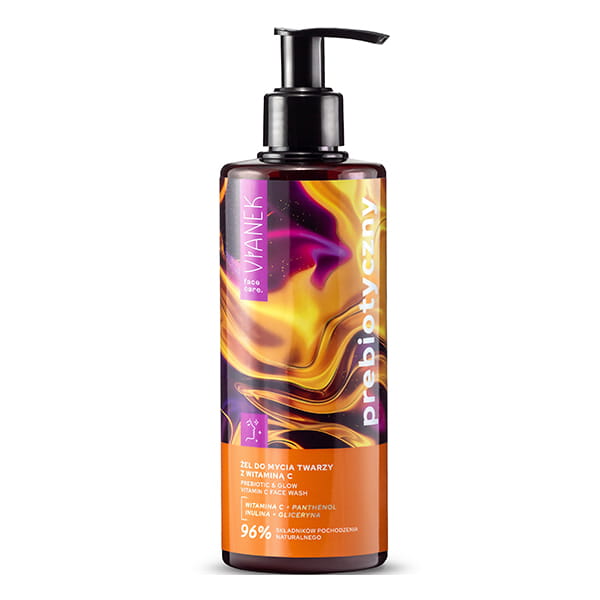 Prebiotyczny żel do mycia twarzy z witaminą C, do oczyszczania każdego rodzaju cery, szczególnie wymagającej wygładzenia i rozświetlenia. Delikatnie, ale skutecznie oczyszcza, poprawiając przy tym elastyczność skóry, wyrównując jej koloryt i dodając blasku - Vianek Prebiotyczny.