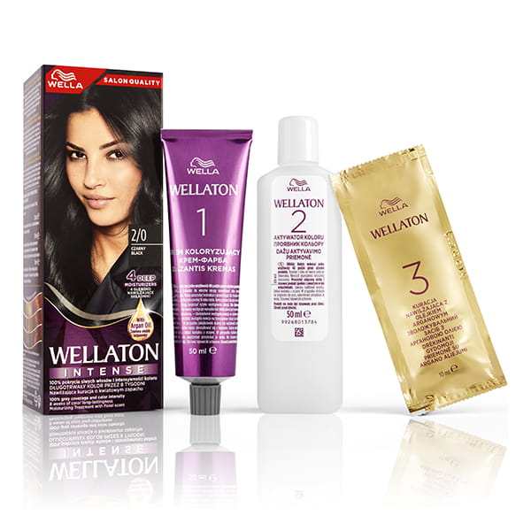 Krem koloryzujący to intensywny i trwały kolor, a także perfekcyjne pokrycie siwych włosów - Wella Wellaton Czarny 2/0.