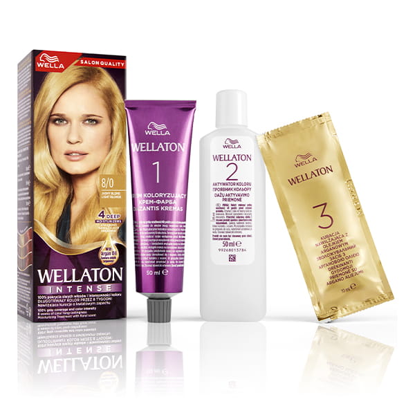 Krem koloryzujący to intensywny i trwały kolor, a także perfekcyjne pokrycie siwych włosów - Wella Wellaton Jasny Blond 8/0.