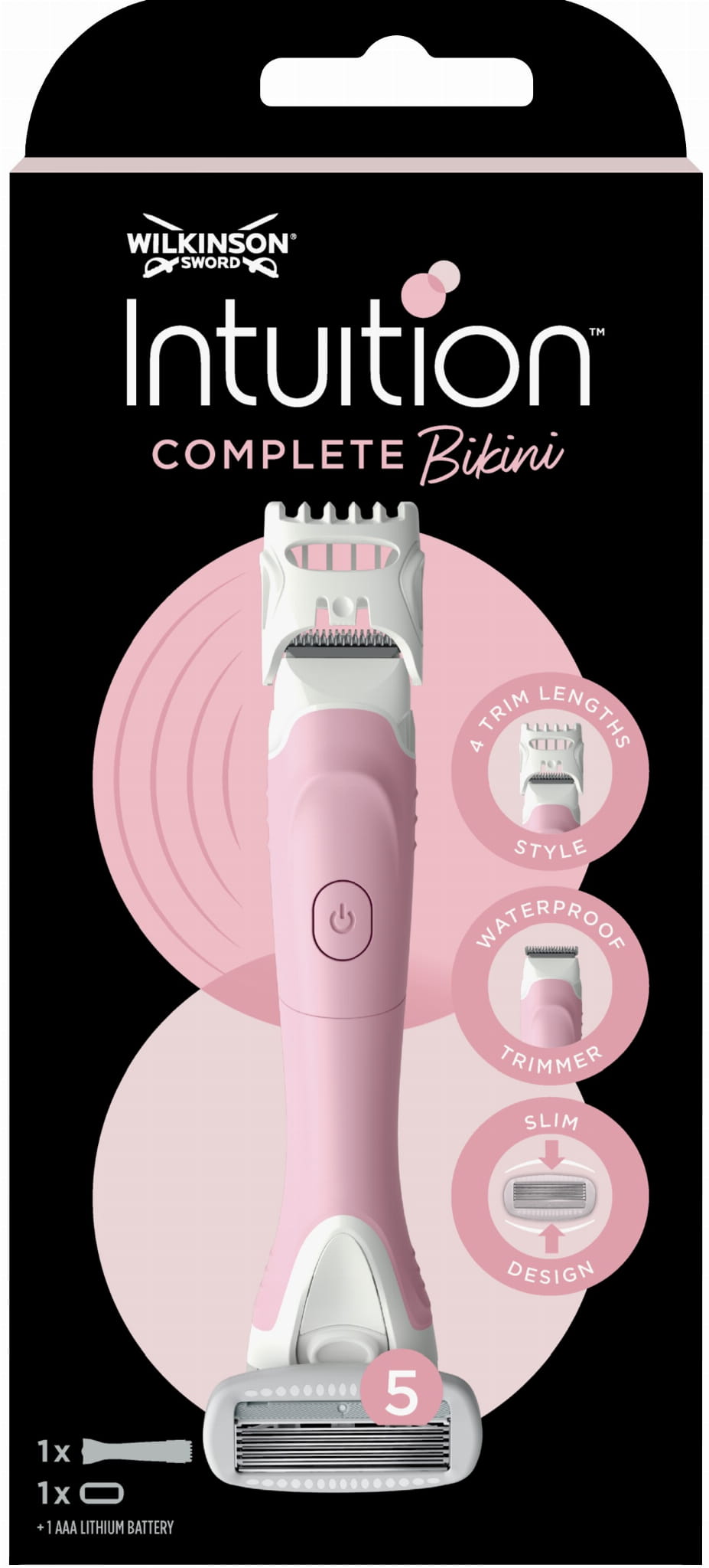Wielofunkcyjne urządzenie 2 w 1 do golenia i stylizacji strefy bikini. Wyposażone w wodoodporny trymer z 4 ustawieniami długości oraz golarkę z 5 ostrzami i paskiem nawilżającym, zapewnia precyzję, komfort i ochronę skóry - Wilkinson Intuition Complete.