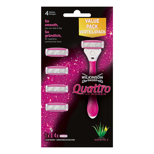 Zestaw do golenia dla kobiet z 1 maszynką i 3 wymiennymi wkładami. Wkłady wyposażone w 4 precyzyjne ostrza oraz pasek nawilżający z Aloe Vera i Witaminą E zapewniają gładką skórę i minimalizują podrażnienia. Ergonomiczna rączka gwarantuje wygodę i kontrolę podczas golenia - Wilkinson Quattro.